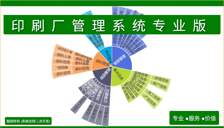 《印刷厂管理系统专业版》是为各印刷厂单位开发的一款软件,该系统有原料入库、原料领用、原料库存、订单登记、成品入库、成品出库、成品库存,订单库存,付款登记、付款欠款统计、收款登记、收款欠款统计、其它收入、其它支出、收入统计、支出统计等功能是一款有效的管理软件,具体功能包话如下: